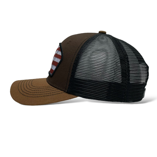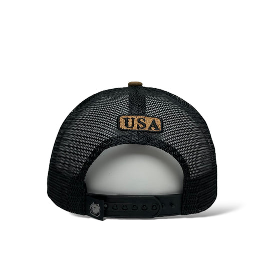 Black trucker hat with USA flag patch, snapback closure, and mesh back.