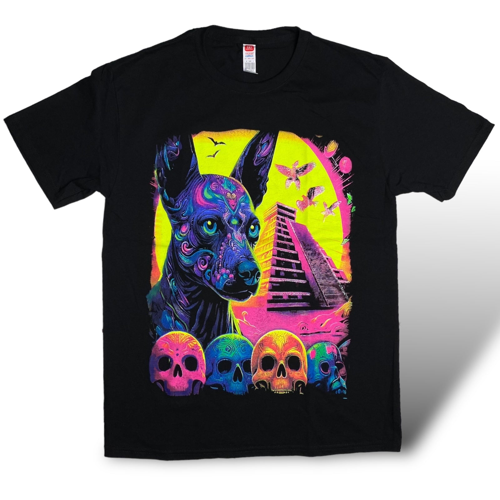 • Xoloitzcuintle Mexican Aztec Dog T Shirt Print Glow in Neon and Black light