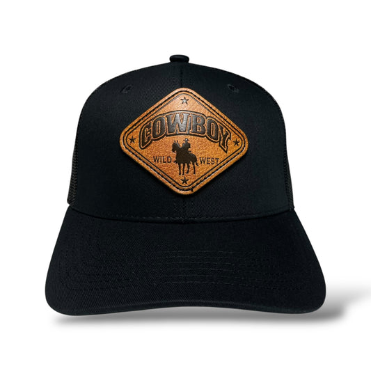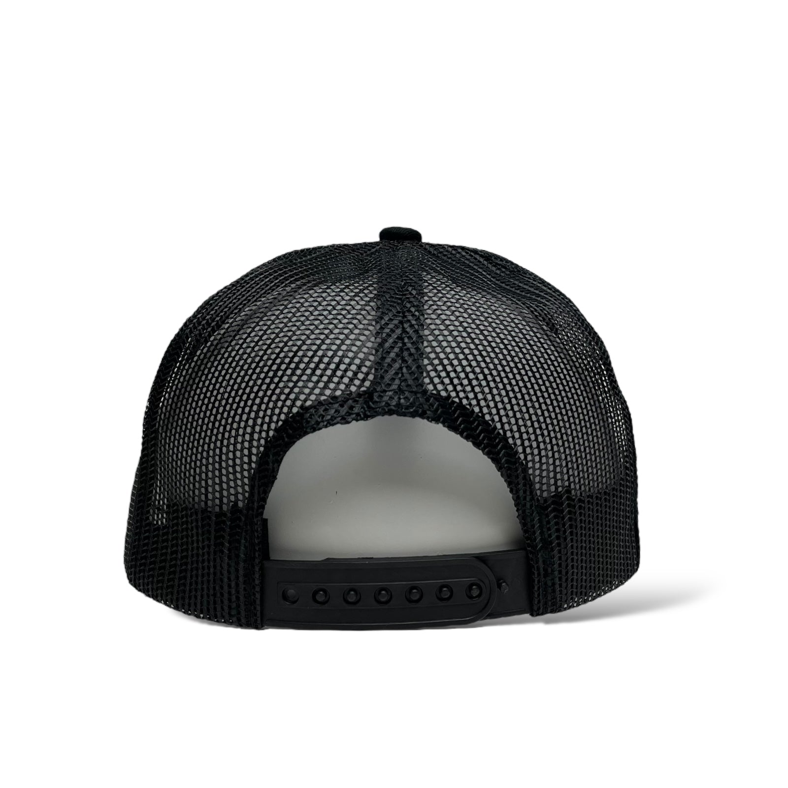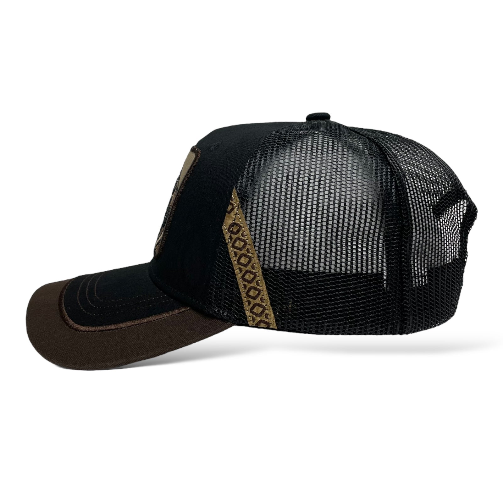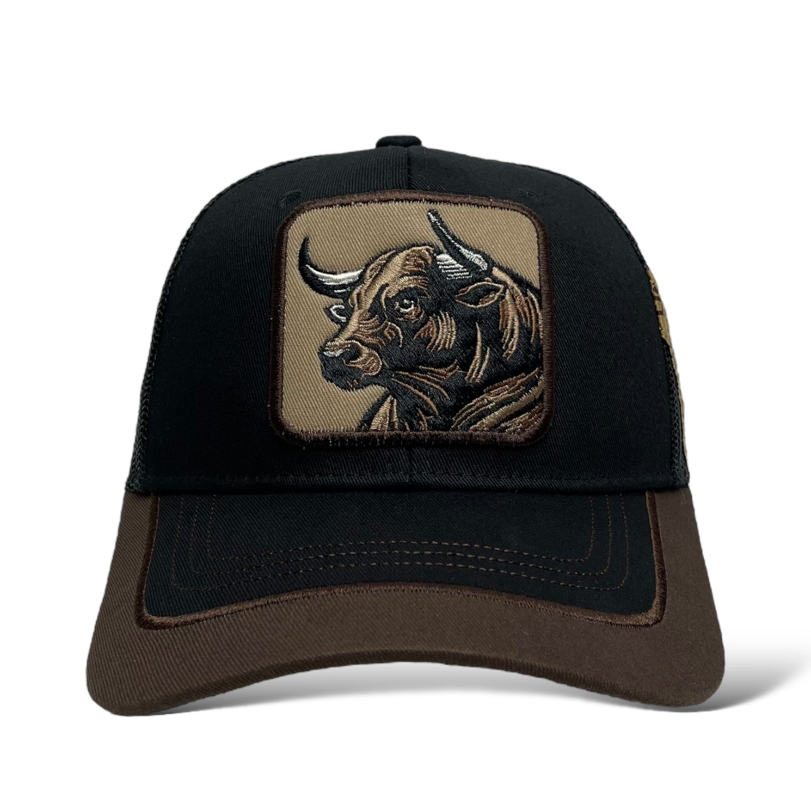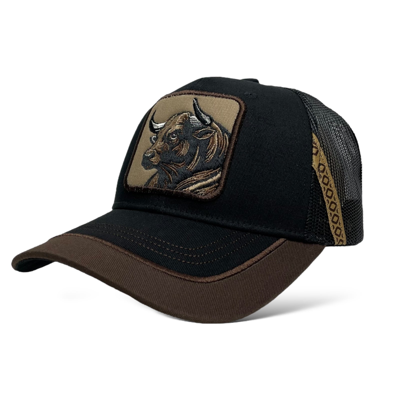 Men’s black trucker hat with bold bull embroidered patch, curved brim, and adjustable closure. Perfect for Western and rodeo fashion.