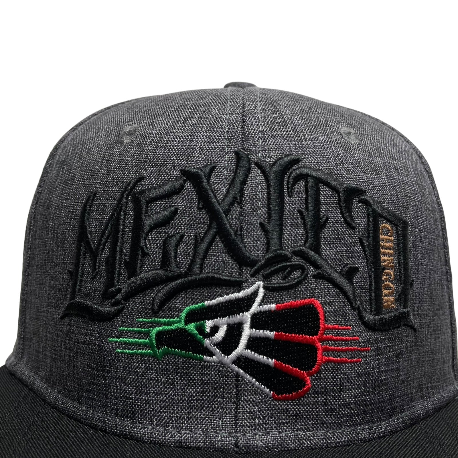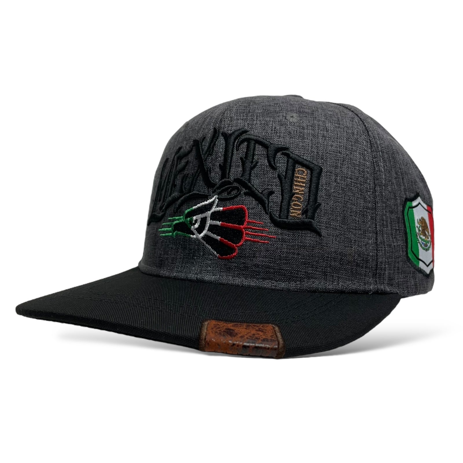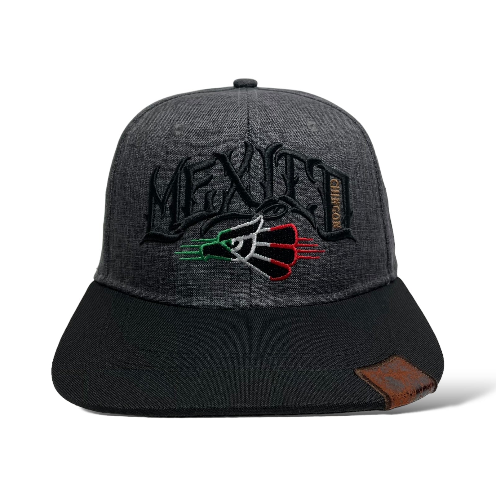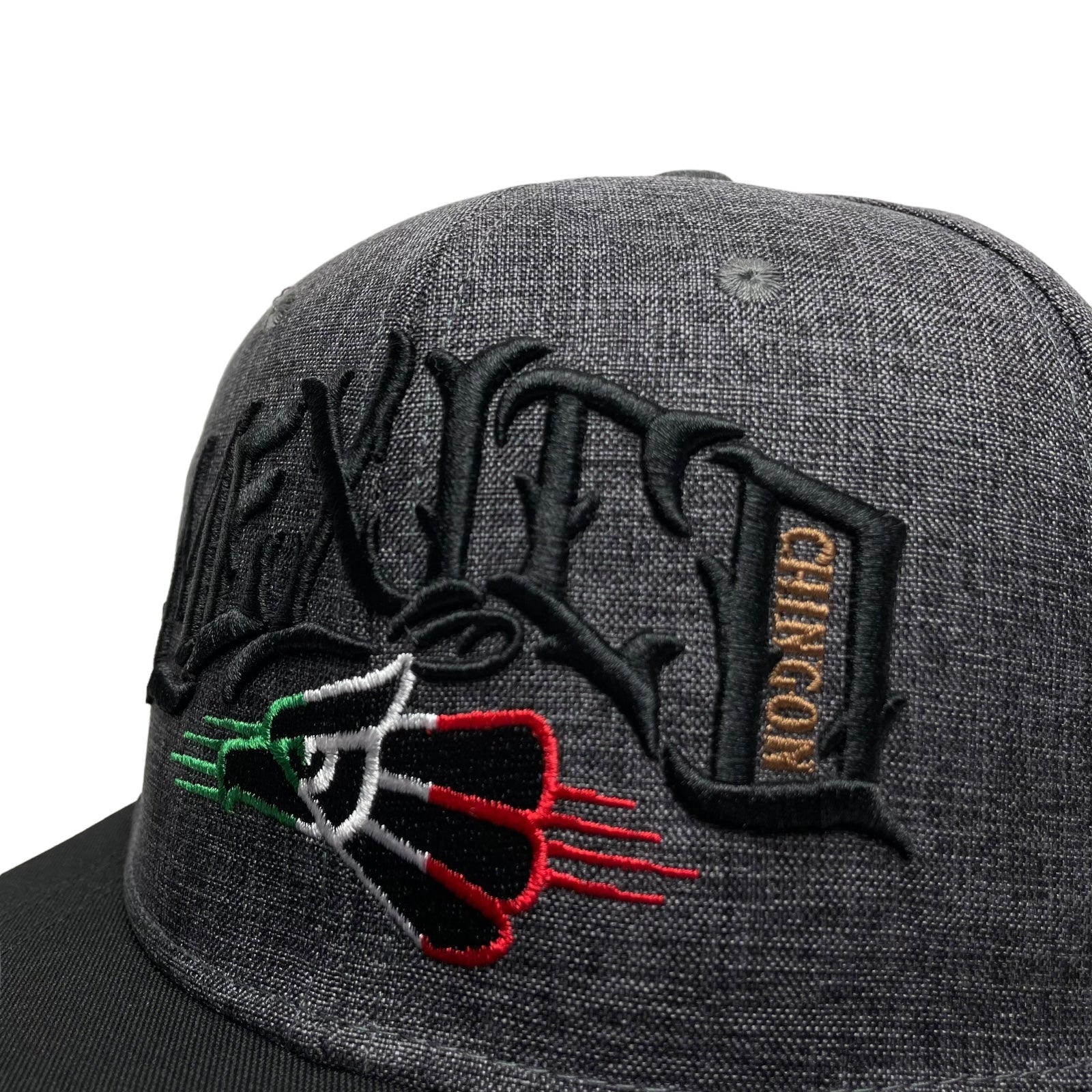 Men’s Gray snapback baseball cap with Mexico eagle and "Chingon" embroidered design, flat brim, and adjustable snapback. Perfect for streetwear style.
