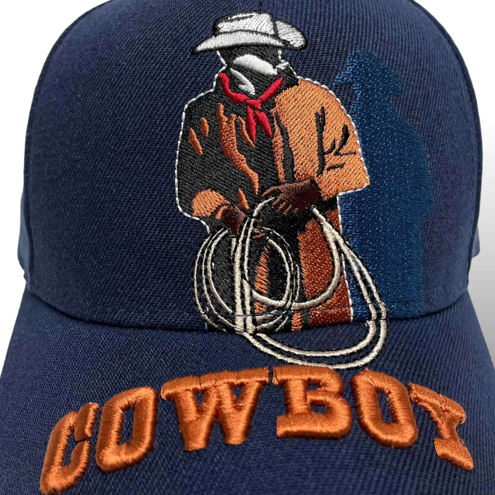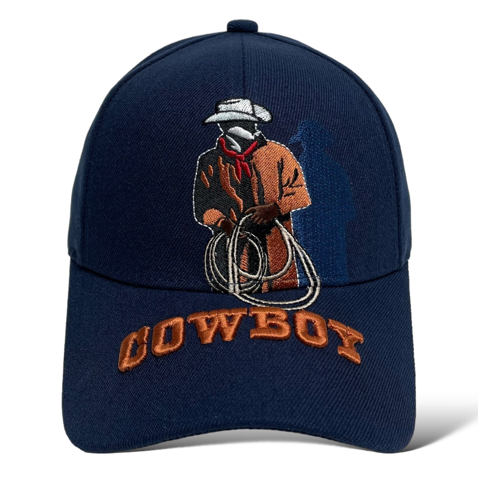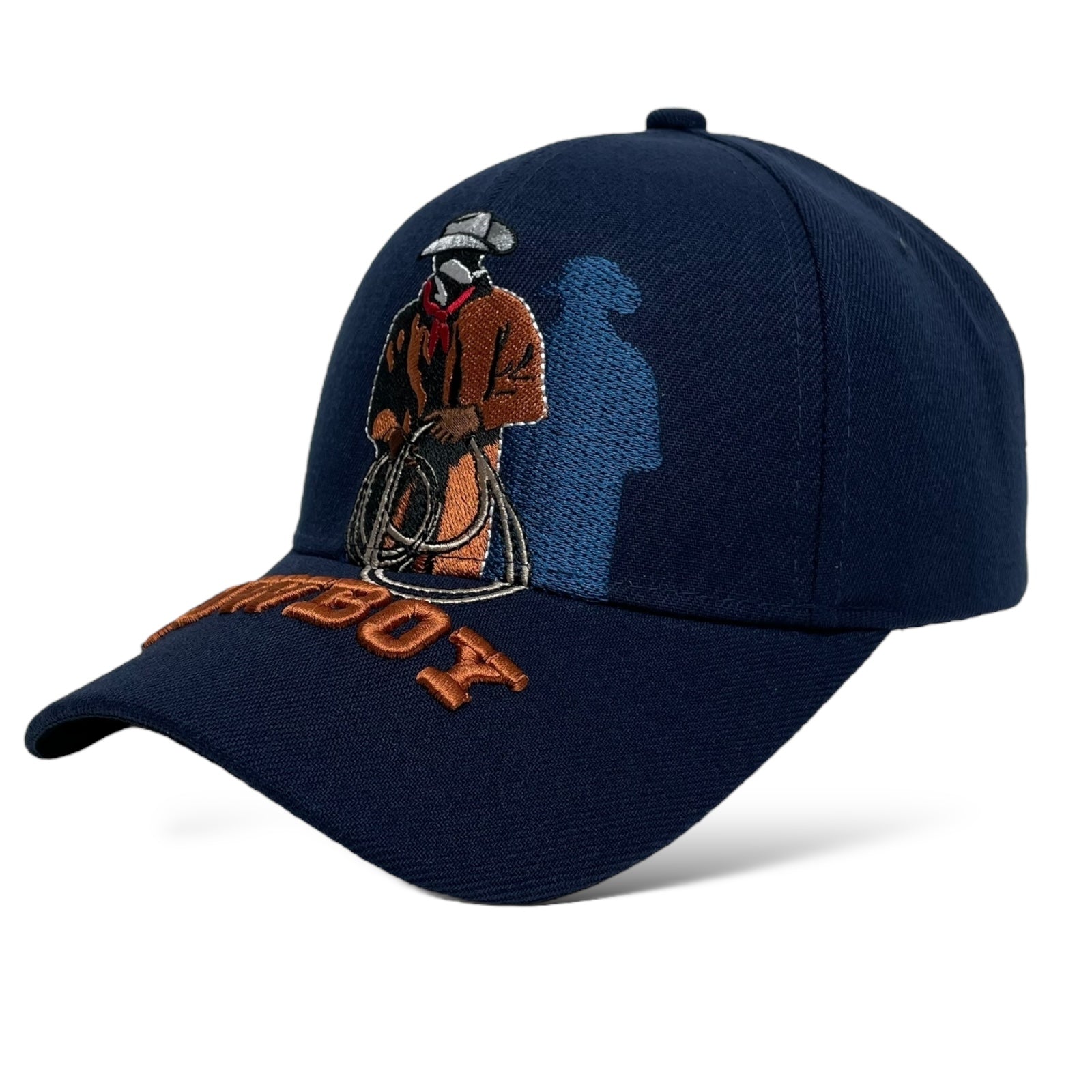 Men’s navy blue baseball cap with cowboy embroidery, curved brim, and hook-and-loop strap. Western rodeo style.