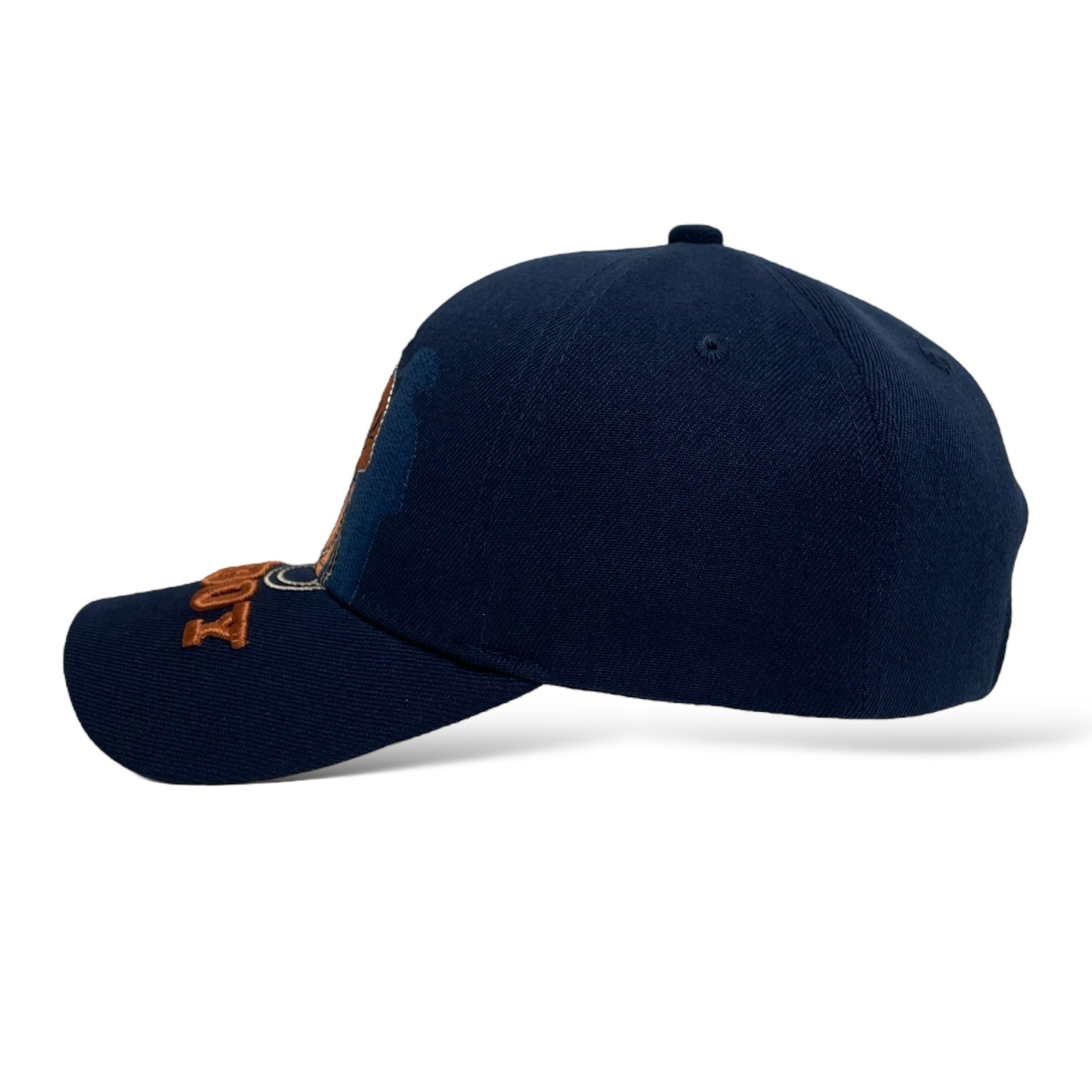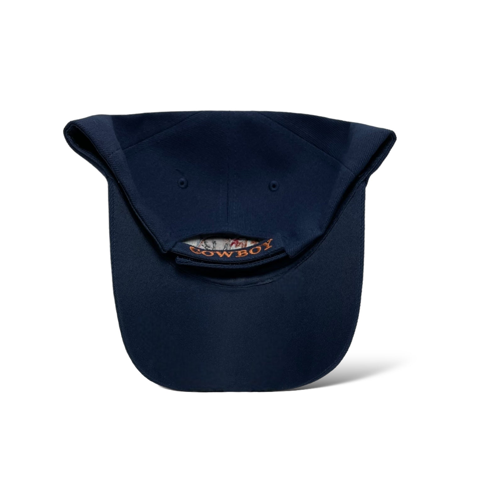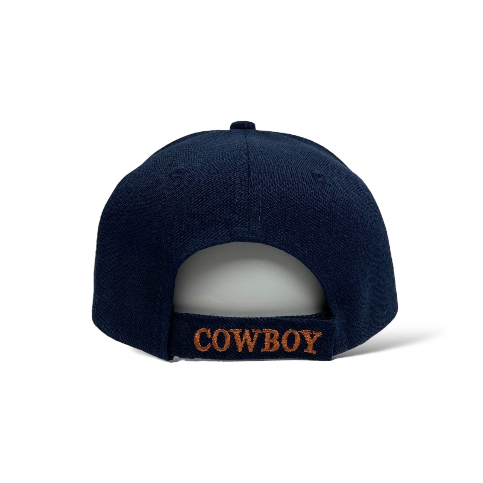 Men’s navy blue baseball cap with cowboy embroidery, curved brim, and hook-and-loop strap. Western rodeo style.