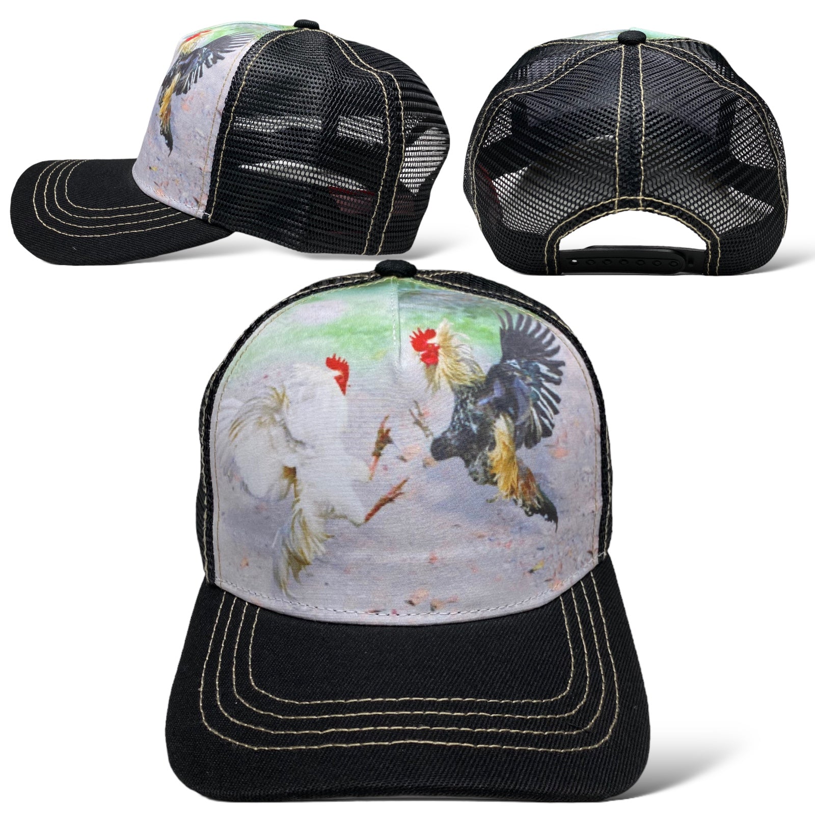- Features: Rooster printed design / Mesh back panels / Curved brim
