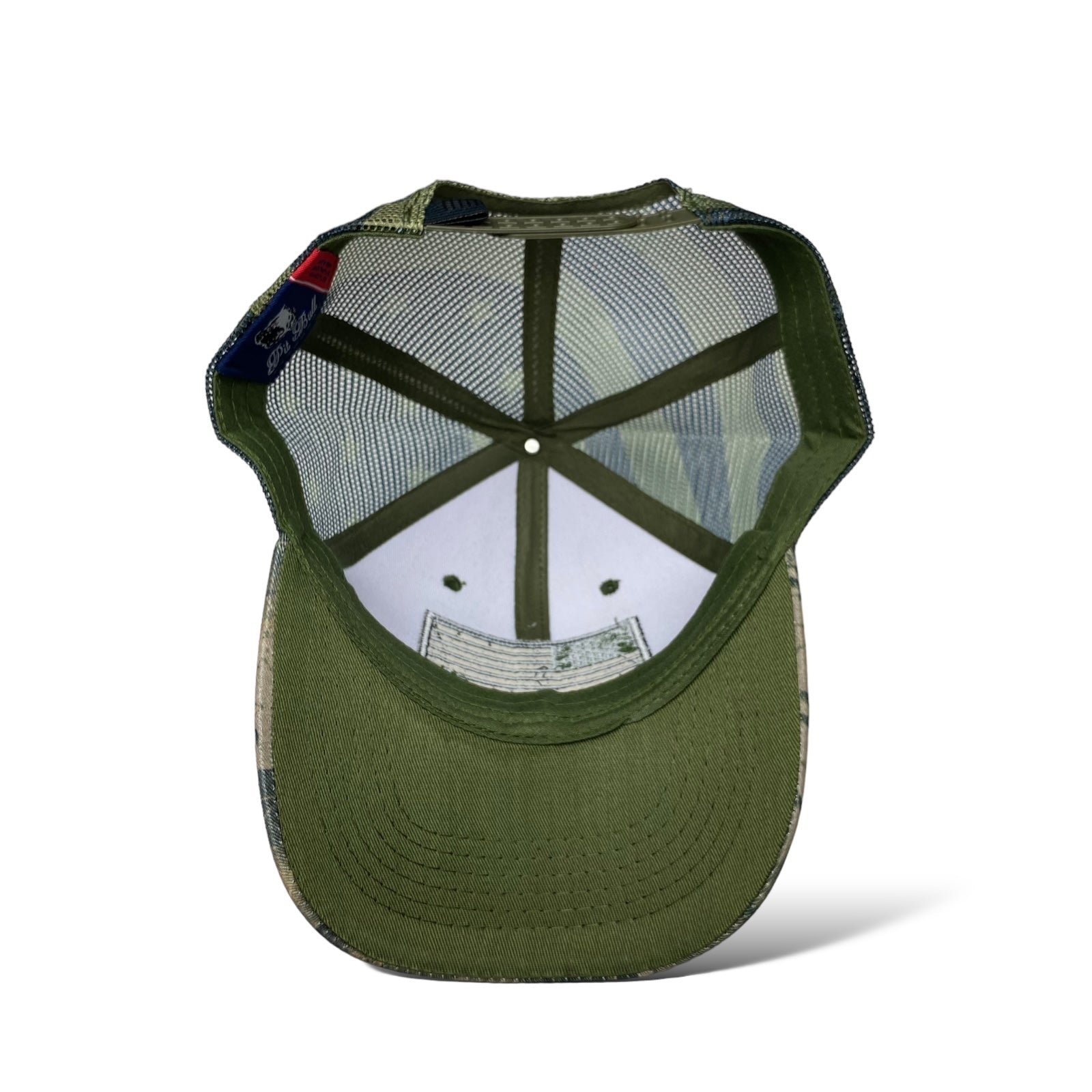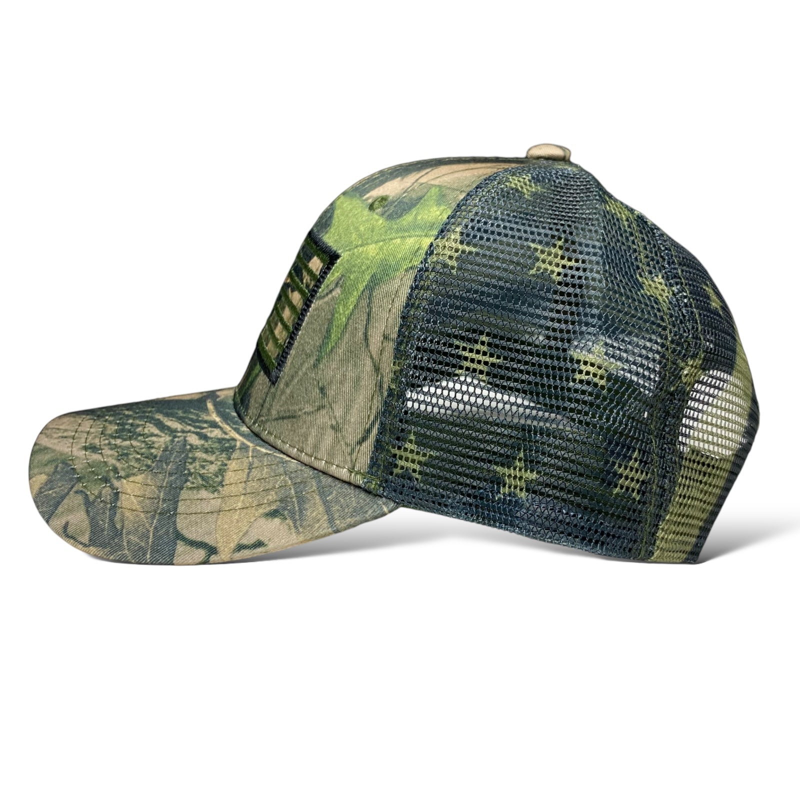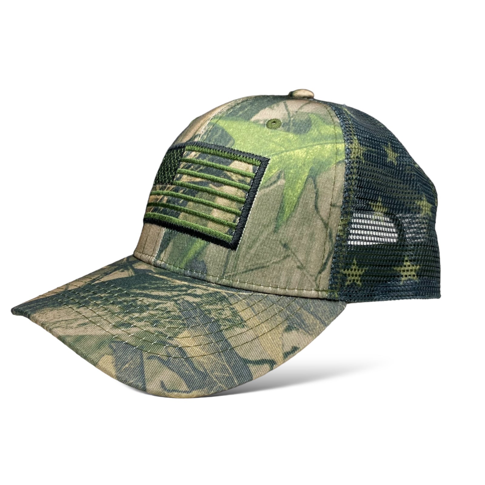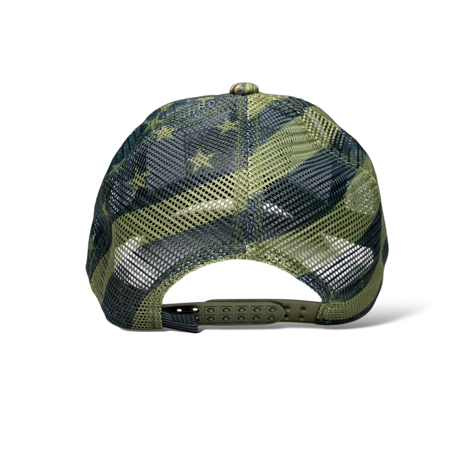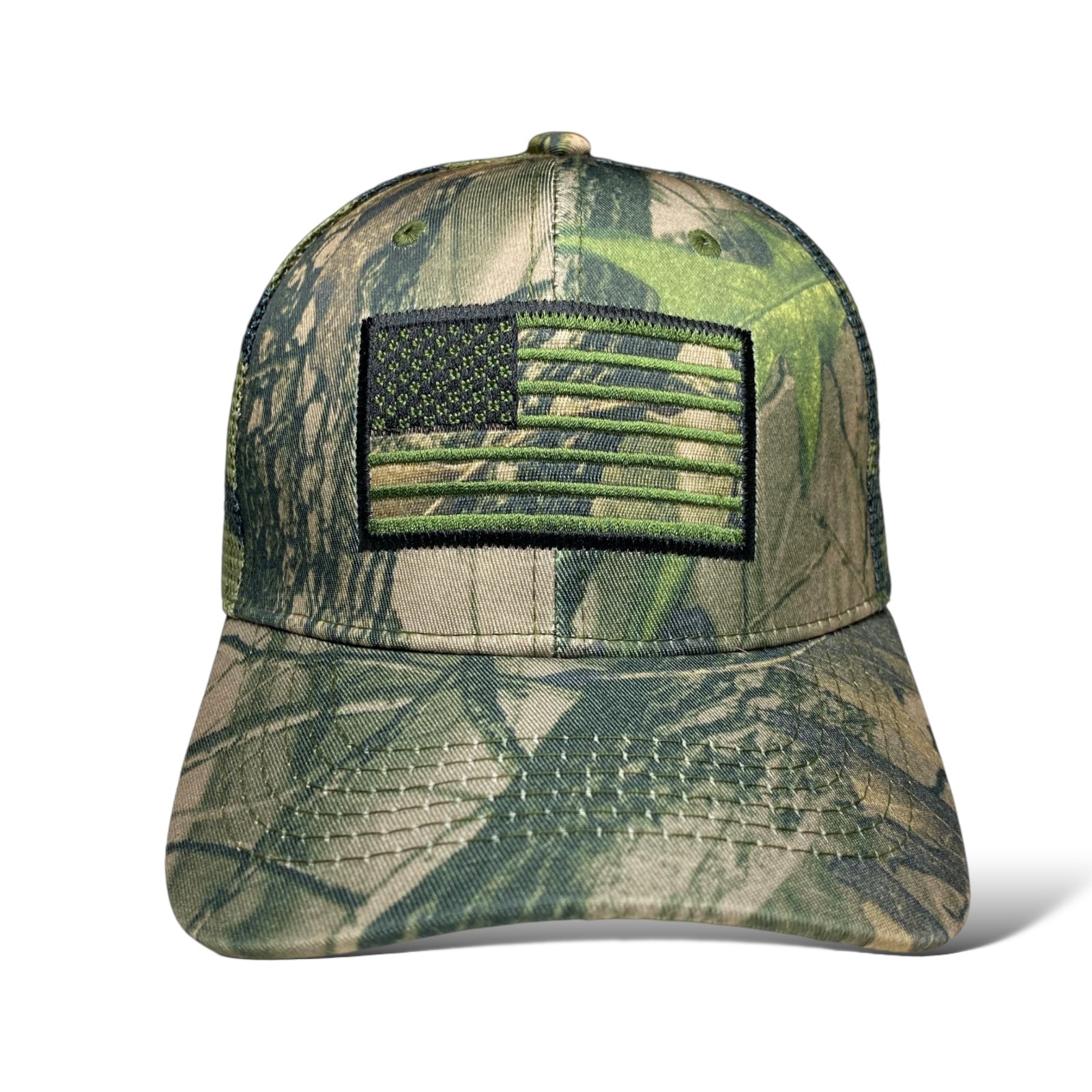 Camo snapback baseball cap with USA flag embroidery and curved brim. Perfect for men who love outdoor adventures and patriotic style.